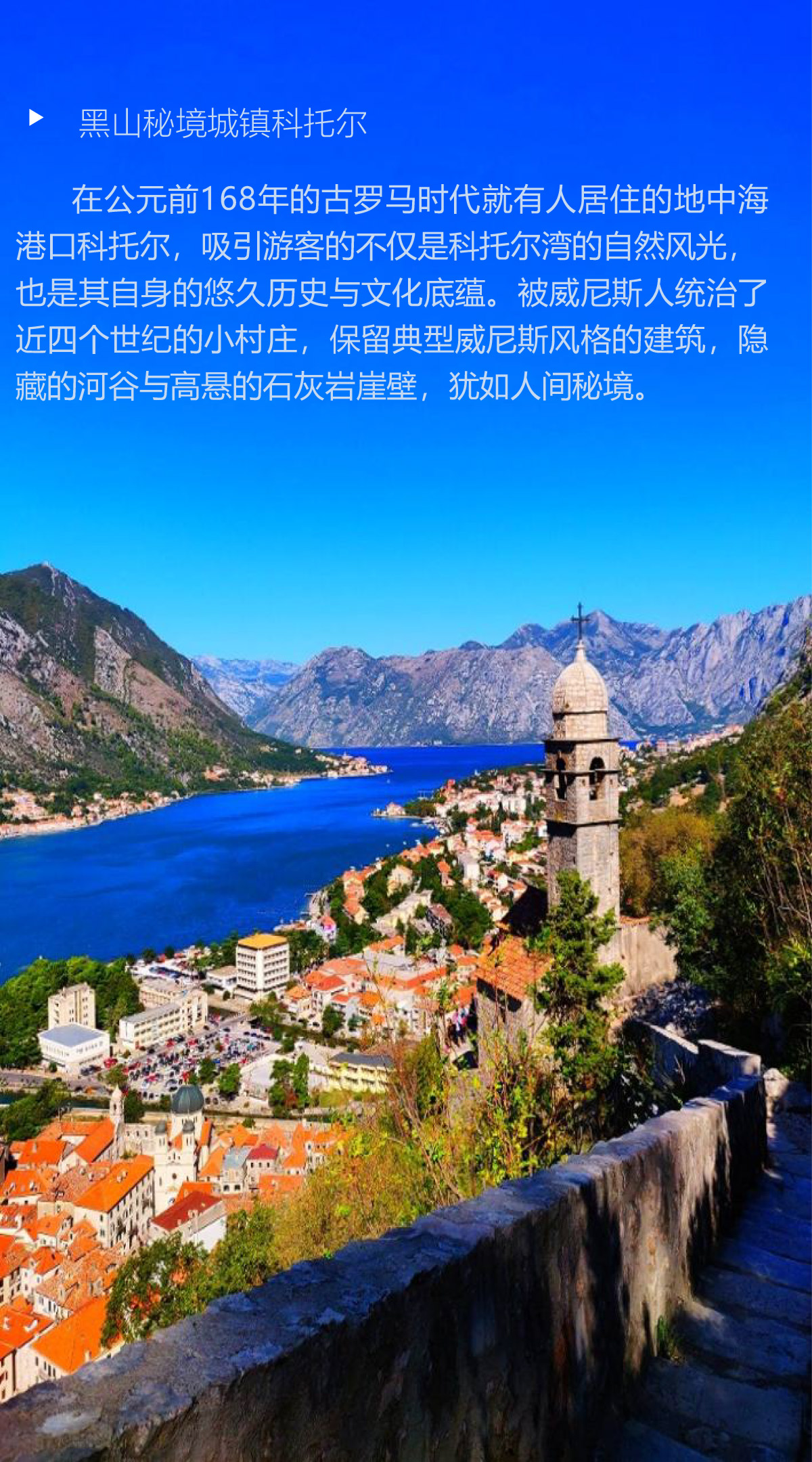 科托尔古城:建立于公园7世纪,是著名的贸易航海城,城内保存良好的中世纪建筑,是亚得里亚海沿岸保存中世纪古城原貌最完整的城市之一,并被列入联合国教科文组织世界遗产名录。