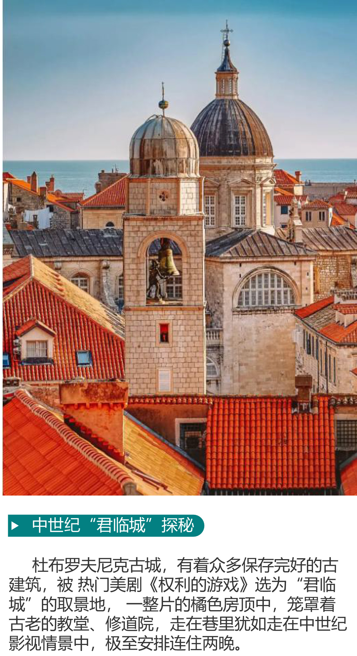 杜布罗夫尼克:位于风景绮丽、气候宜人的达尔马提亚海岸南部石灰岩半岛上,依山傍海,被誉为”亚得里亚海的明珠“,是欧洲中世纪建筑保存比较完好的一座城市,既能欣赏亚得里亚海美景,又能感受到旧城的历史沧桑。