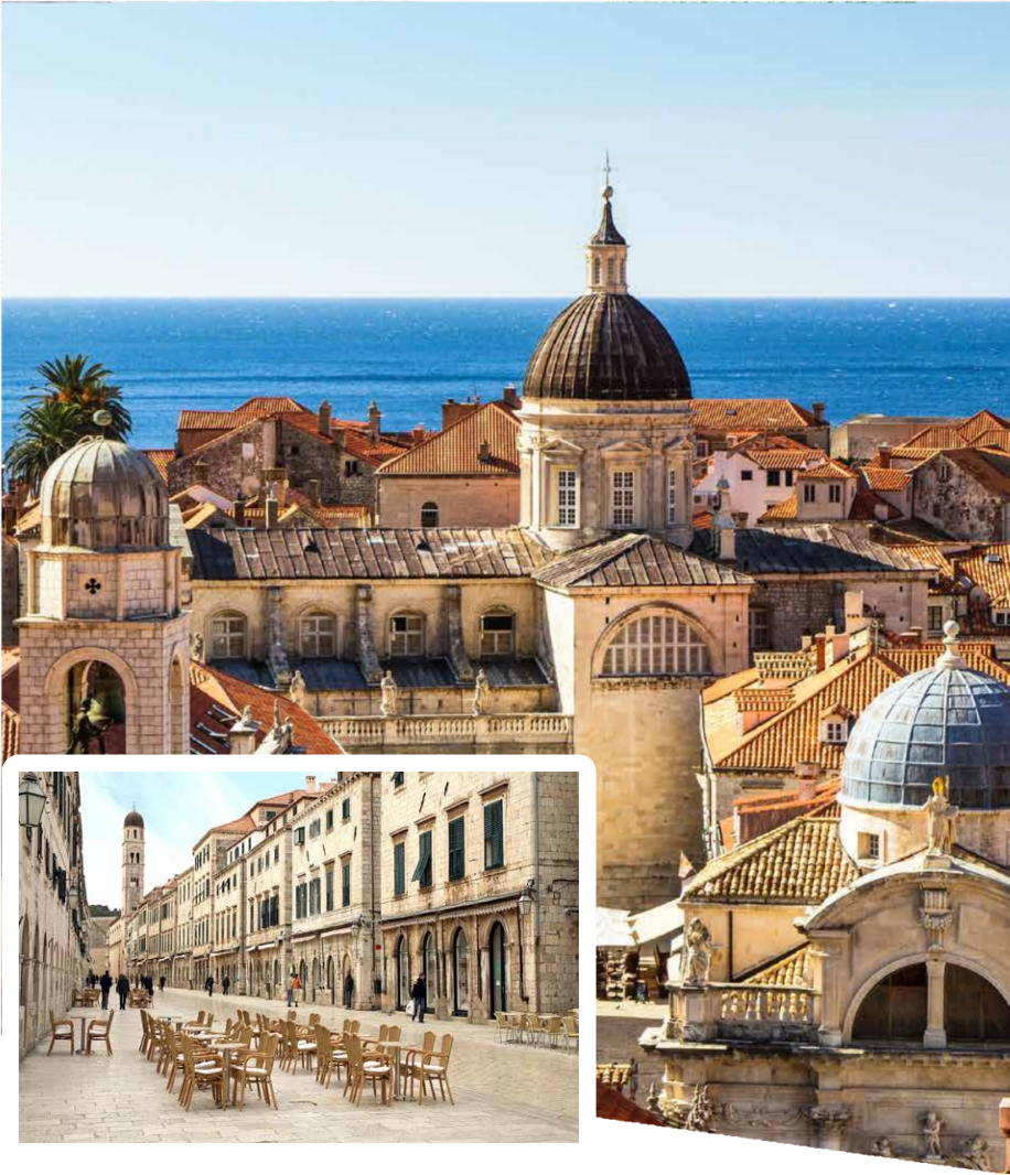 游览杜布罗夫尼克古城,走进多米尼克修道院,欣赏 14-15世纪的宗教艺术品的同时,观赏其独特的建筑空间设计;随后行走在贯穿古城区的史特拉敦大道上,沿路感受两侧建筑古老的韵味,抵达热闹的罗日广场。