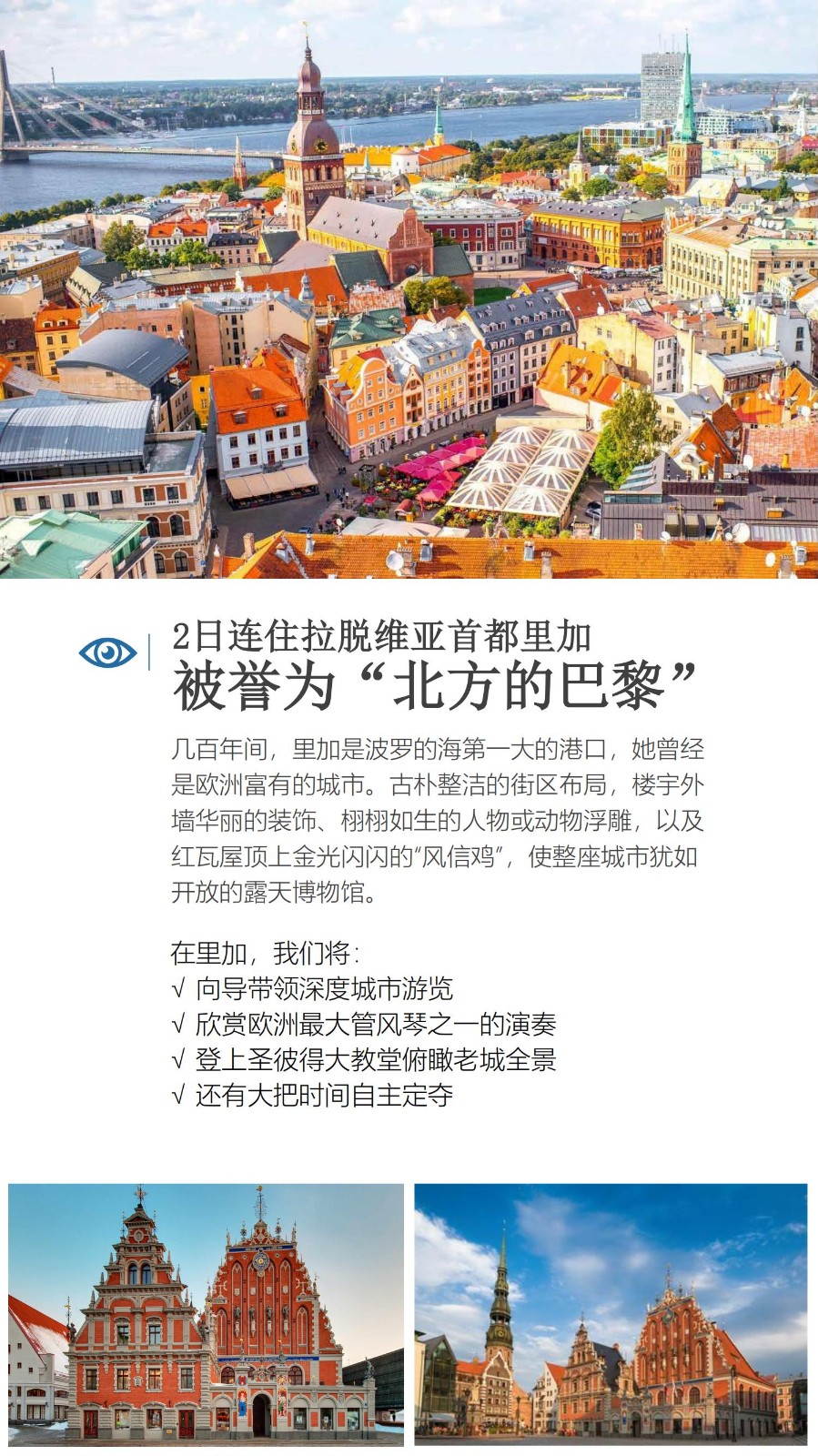 里加:在中世纪时,里加是繁荣发达的港口,现波罗的海三国中最大的城市。里加老城是建筑爱好者的立体图书馆,曾被冠以“北方巴黎”的称呼,也许是对这个城市建筑、艺术、文化等领域的最大褒奖。