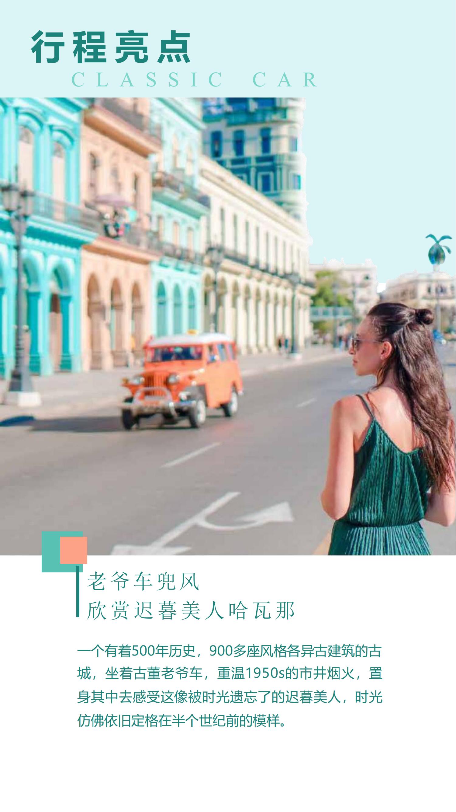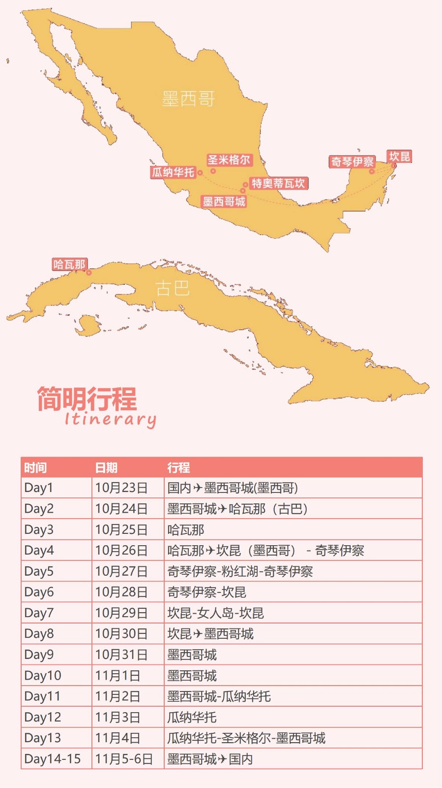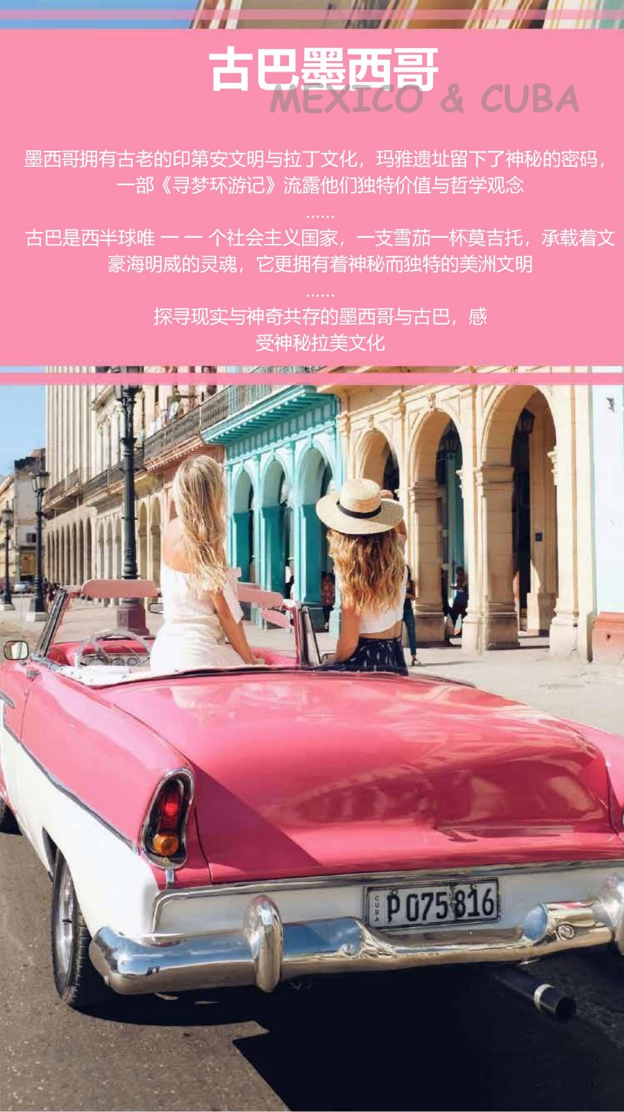 老爷车兜风,欣赏迟暮美人哈瓦那;一年一度盛大节日——墨西哥亡灵节;俯瞰瓜城——走进《寻梦环游记》的梦幻世界;看世界奇迹——玛雅文明的伟大遗迹;在奇妙的玛雅天井中游泳;参观梦幻般粉红色的天空之镜;体验古巴雪茄那烟雾中的贵气;享受阳光海滩,体验地道拉美假期