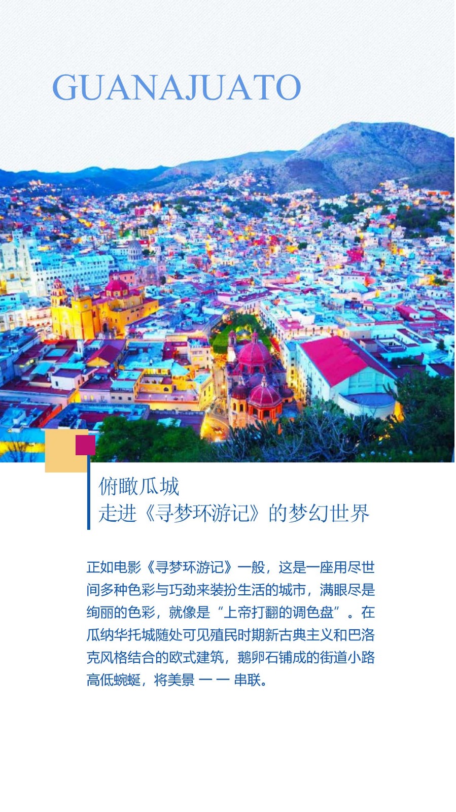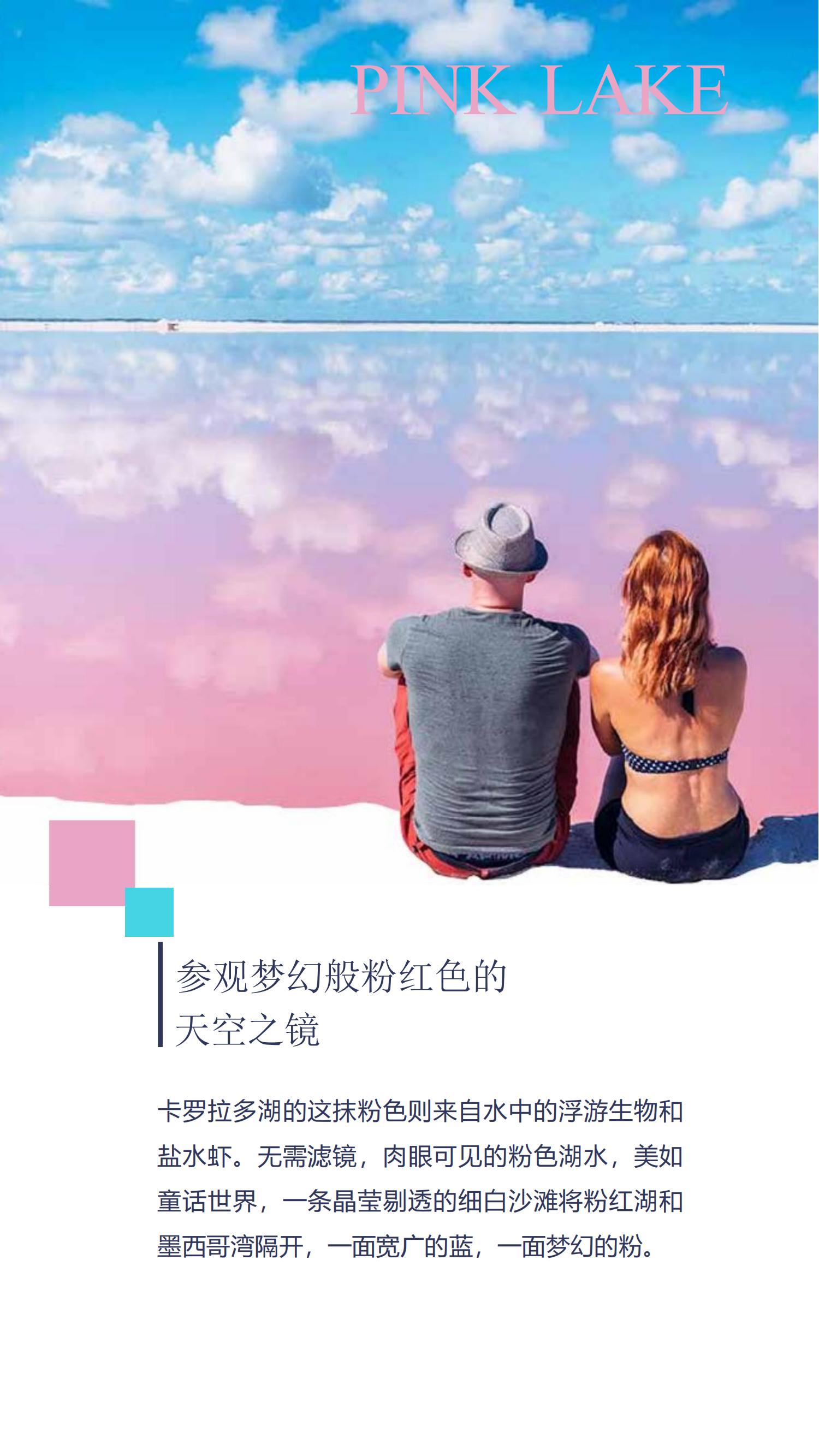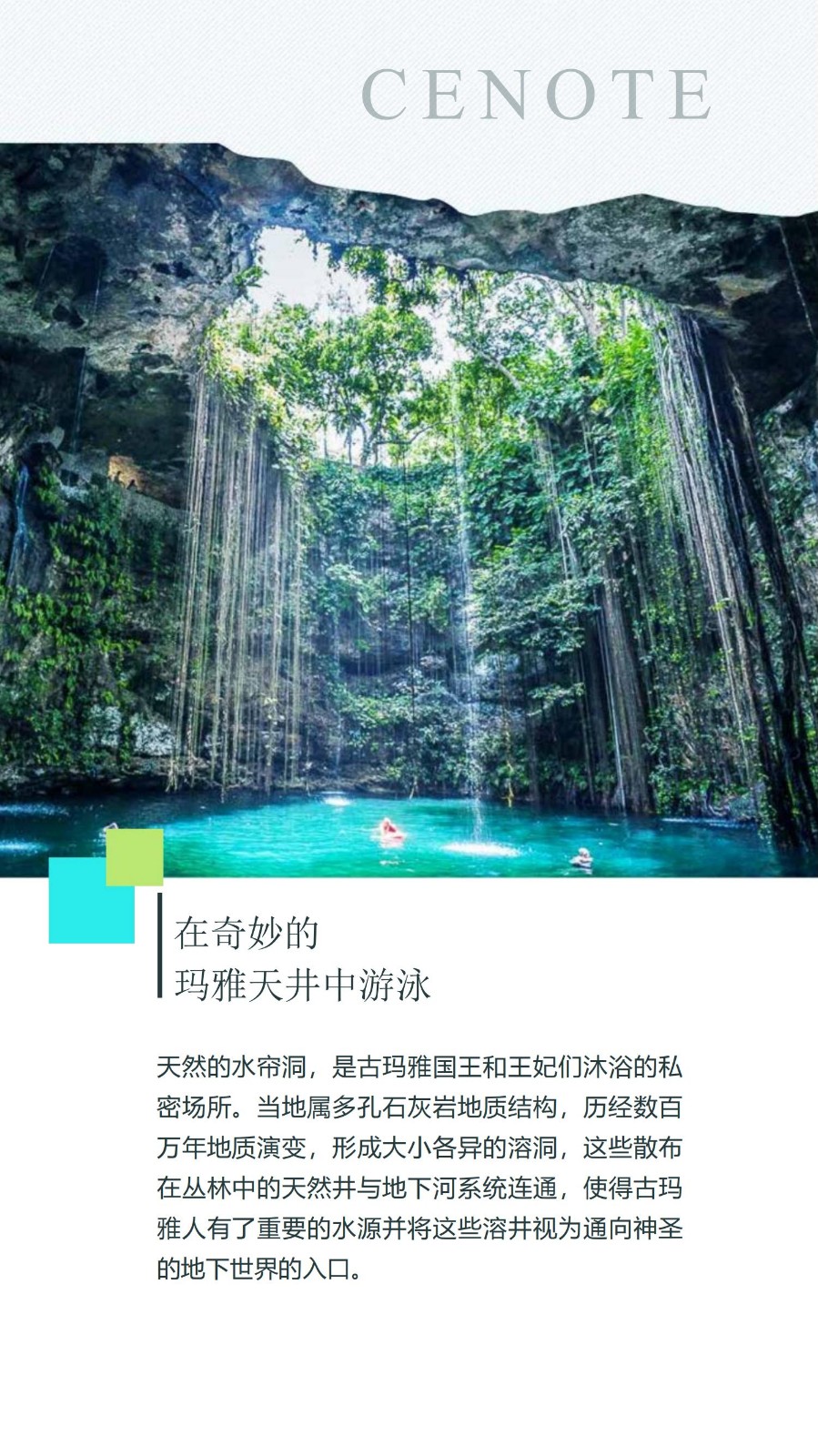 老爷车兜风,欣赏迟暮美人哈瓦那;一年一度盛大节日——墨西哥亡灵节;俯瞰瓜城——走进《寻梦环游记》的梦幻世界;看世界奇迹——玛雅文明的伟大遗迹;在奇妙的玛雅天井中游泳;参观梦幻般粉红色的天空之镜;体验古巴雪茄那烟雾中的贵气;享受阳光海滩,体验地道拉美假期
