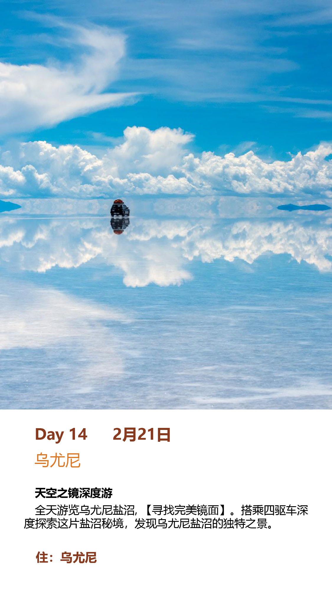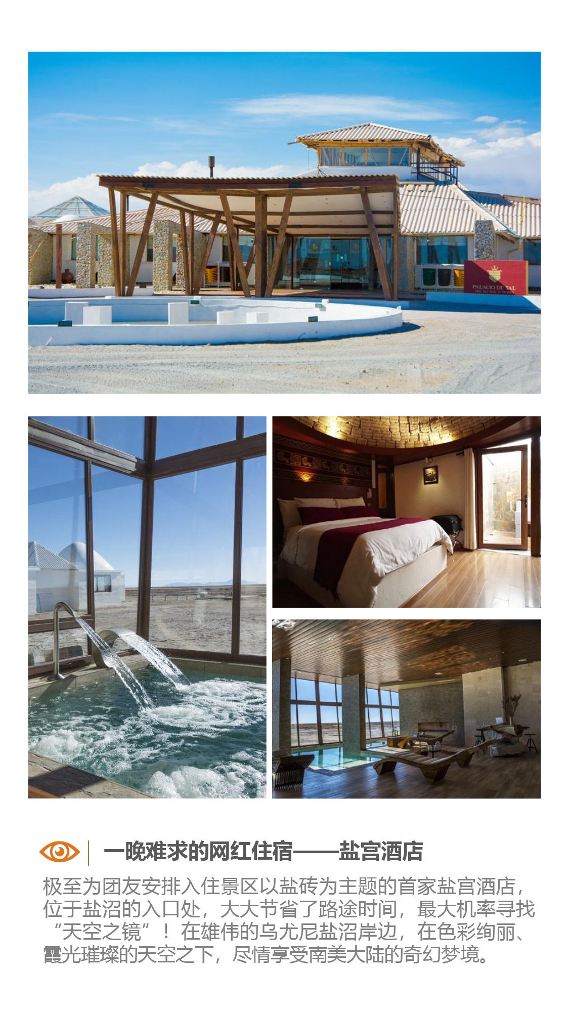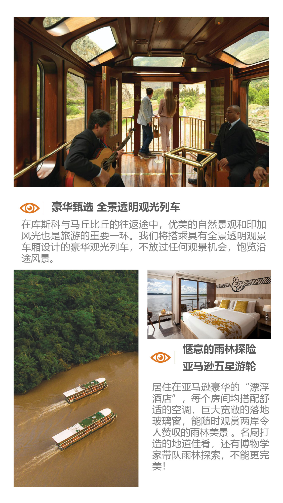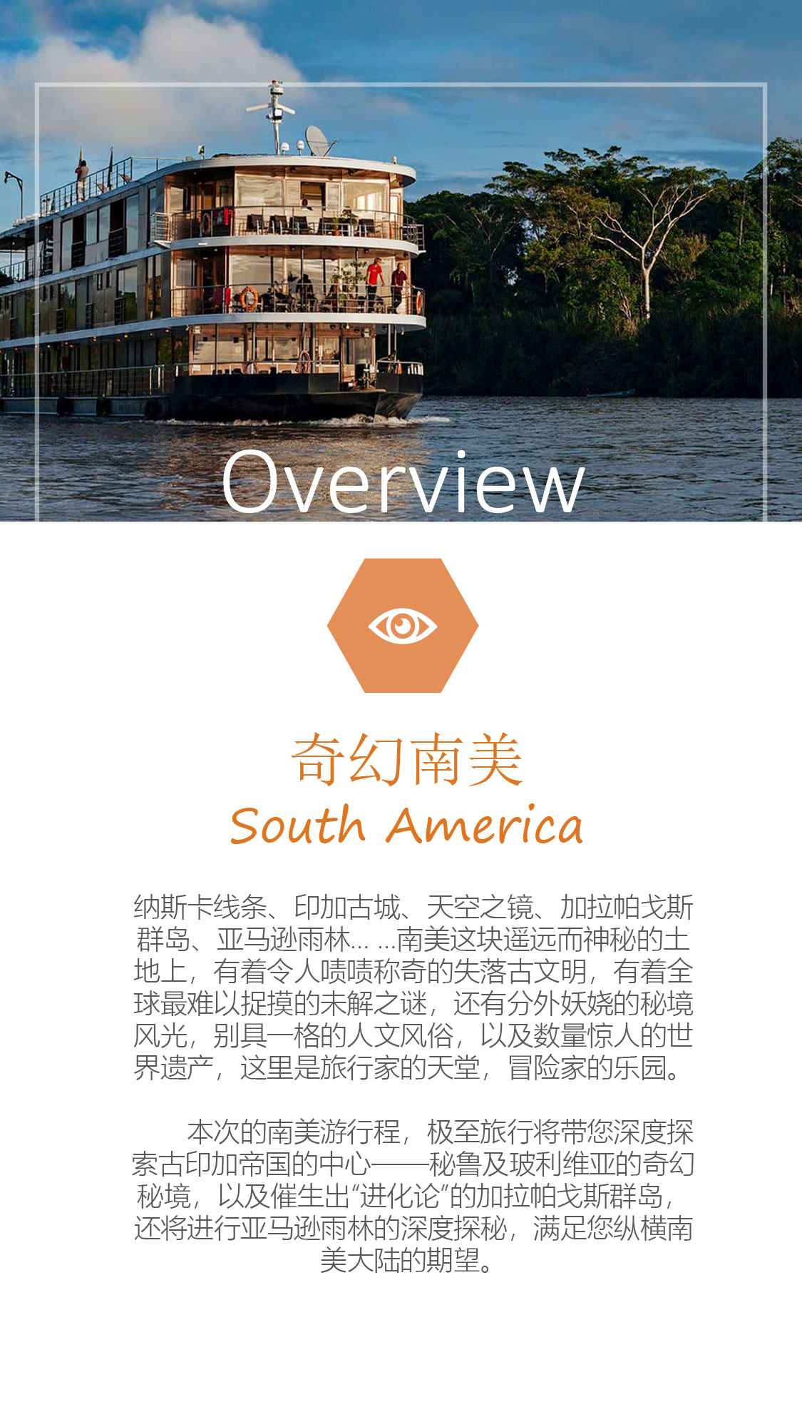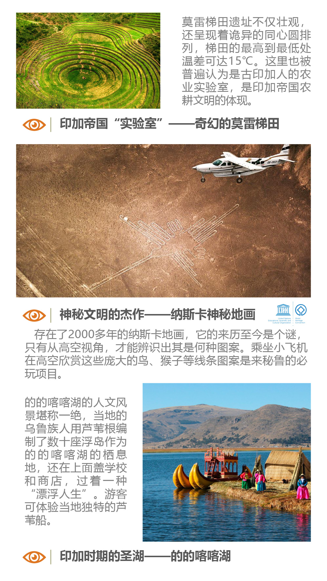 美到窒息的“天空之镜”——乌尤尼盐沼;失落的天空之城——马丘比丘;印加帝国“实验室”——奇幻的莫雷梯田;神秘文明的杰作——纳斯卡神秘地画;印加时期的圣湖——的的喀喀湖;印加帝国第二大城市——基多老城;进化论的起源——加拉帕戈斯群岛;地球之肺——亚马逊雨林;一晚难求的网红住宿——盐宫酒店;豪华甄选 全景透明观光列车;惬意的雨林探险亚马逊五星游轮;