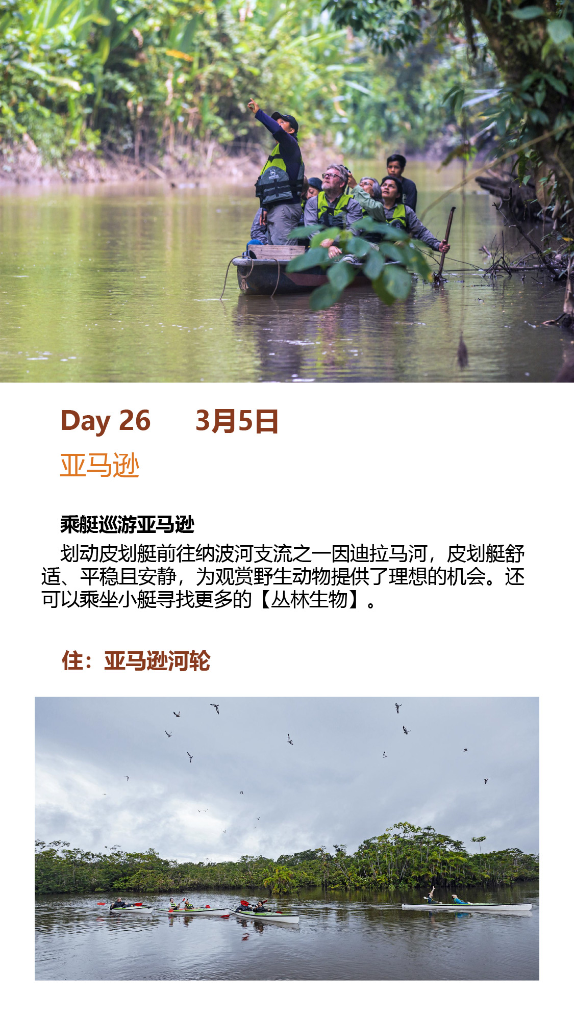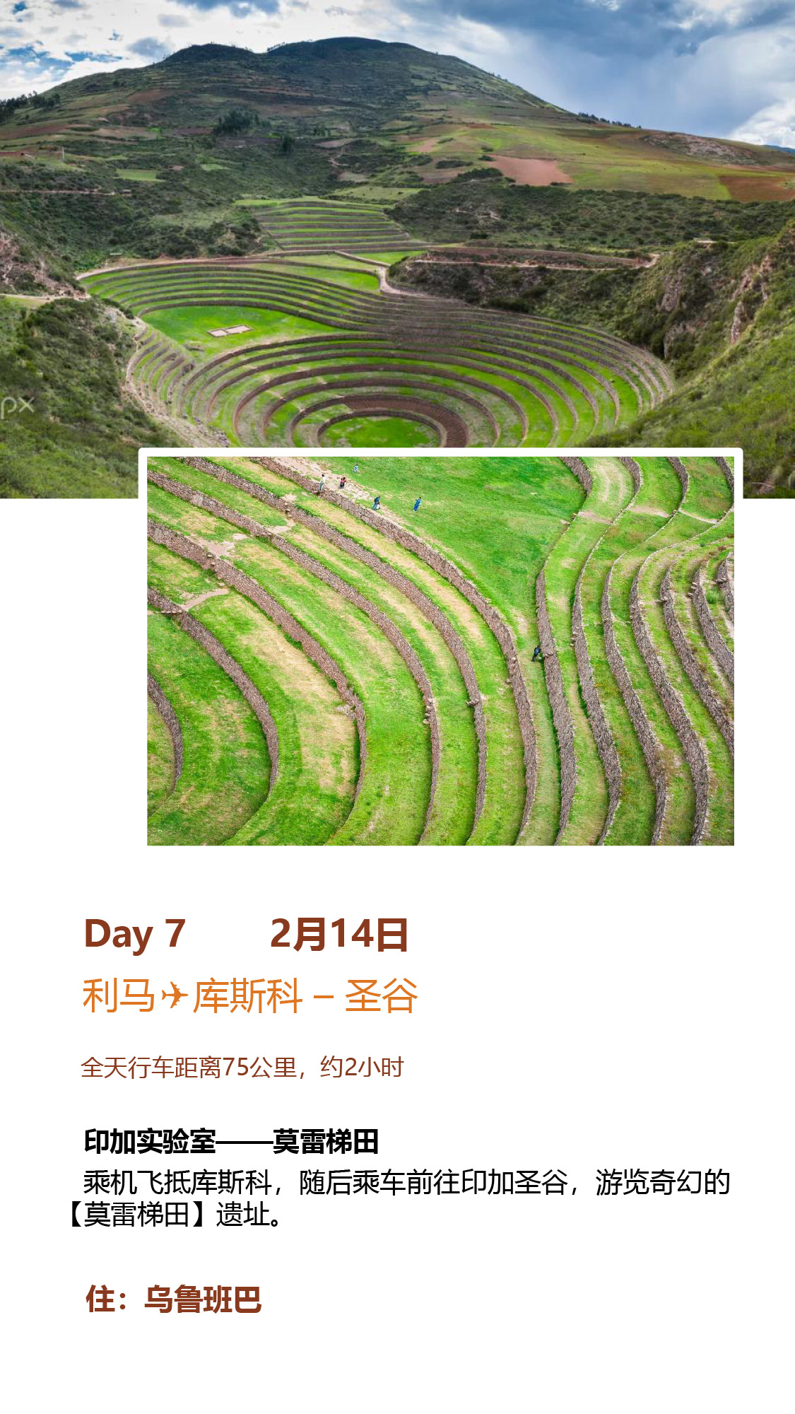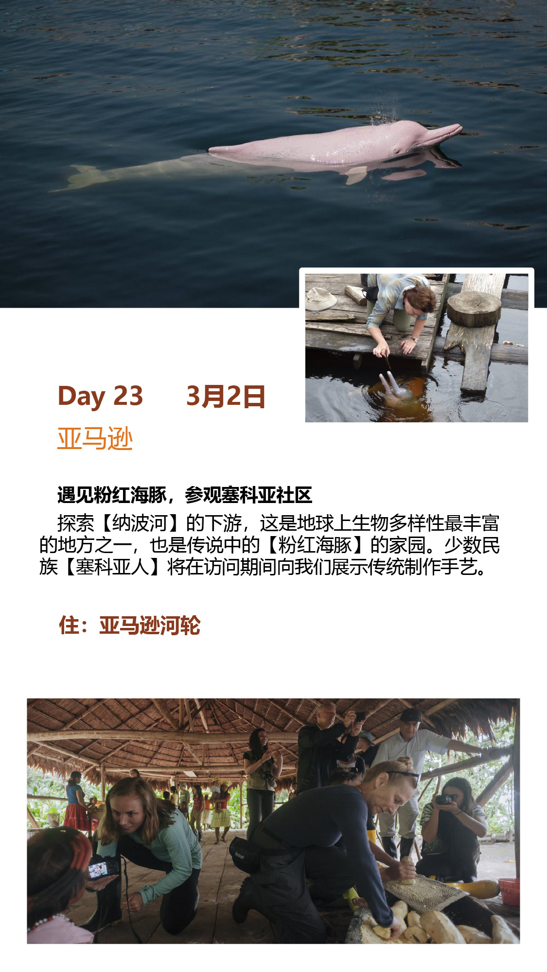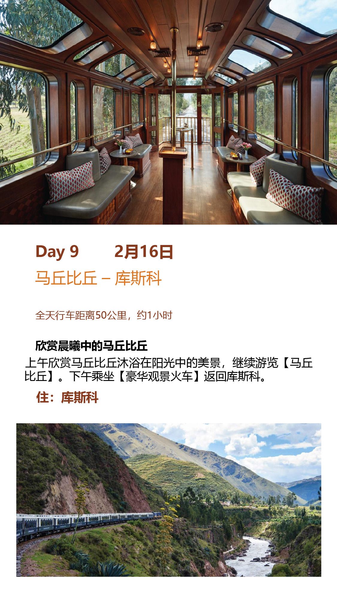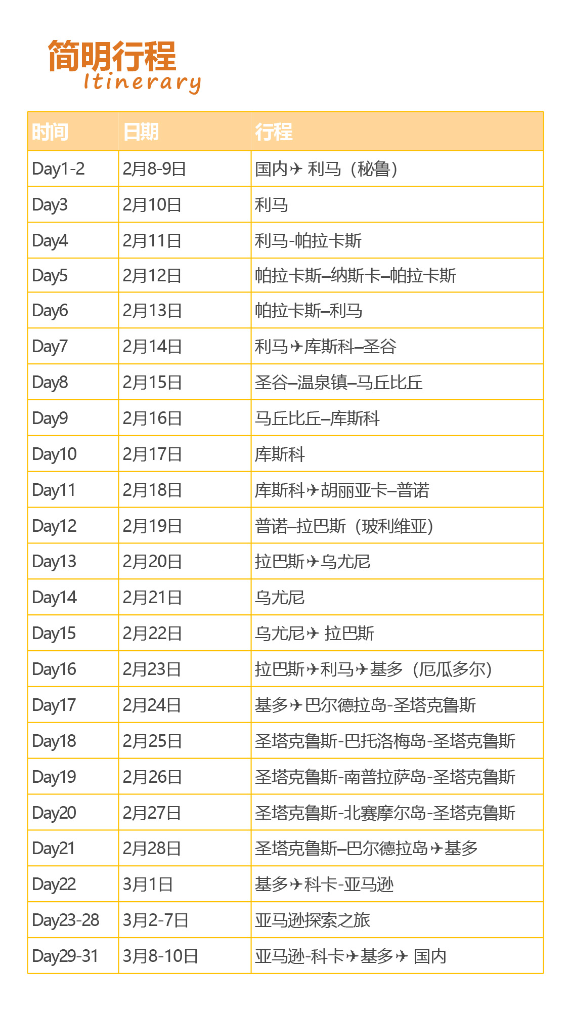 美到窒息的“天空之镜”——乌尤尼盐沼;失落的天空之城——马丘比丘;印加帝国“实验室”——奇幻的莫雷梯田;神秘文明的杰作——纳斯卡神秘地画;印加时期的圣湖——的的喀喀湖;印加帝国第二大城市——基多老城;进化论的起源——加拉帕戈斯群岛;地球之肺——亚马逊雨林;一晚难求的网红住宿——盐宫酒店;豪华甄选 全景透明观光列车;惬意的雨林探险亚马逊五星游轮;