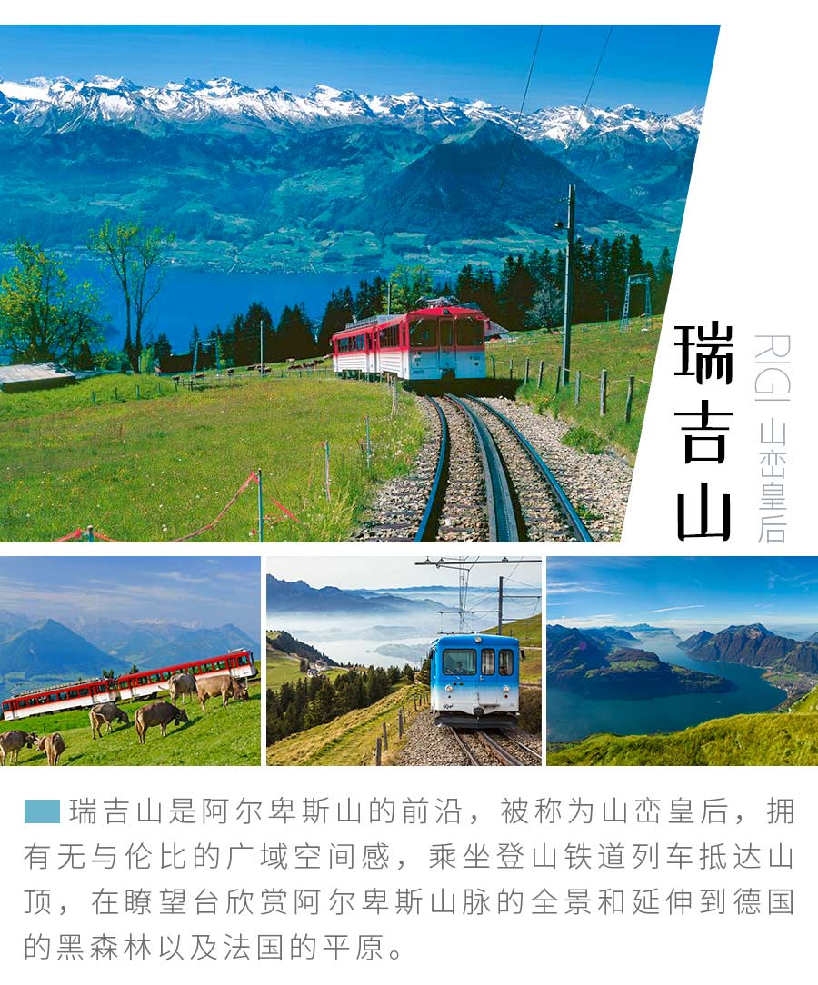 瑞吉山:阿尔卑斯山的最前沿,被称为“山峦皇后”,是瑞士中部最有名的瞭望台,在山顶的瞭望台上可以欣赏到阿尔卑斯山脉的全景观和延伸到德国的黑森林和法国的平原。1871年这里修建了登山铁道,也是欧洲的第一条登山铁道,仍保留有古老的齿轮蒸汽机车。从韦吉斯起始的空中缆车通向山顶。
