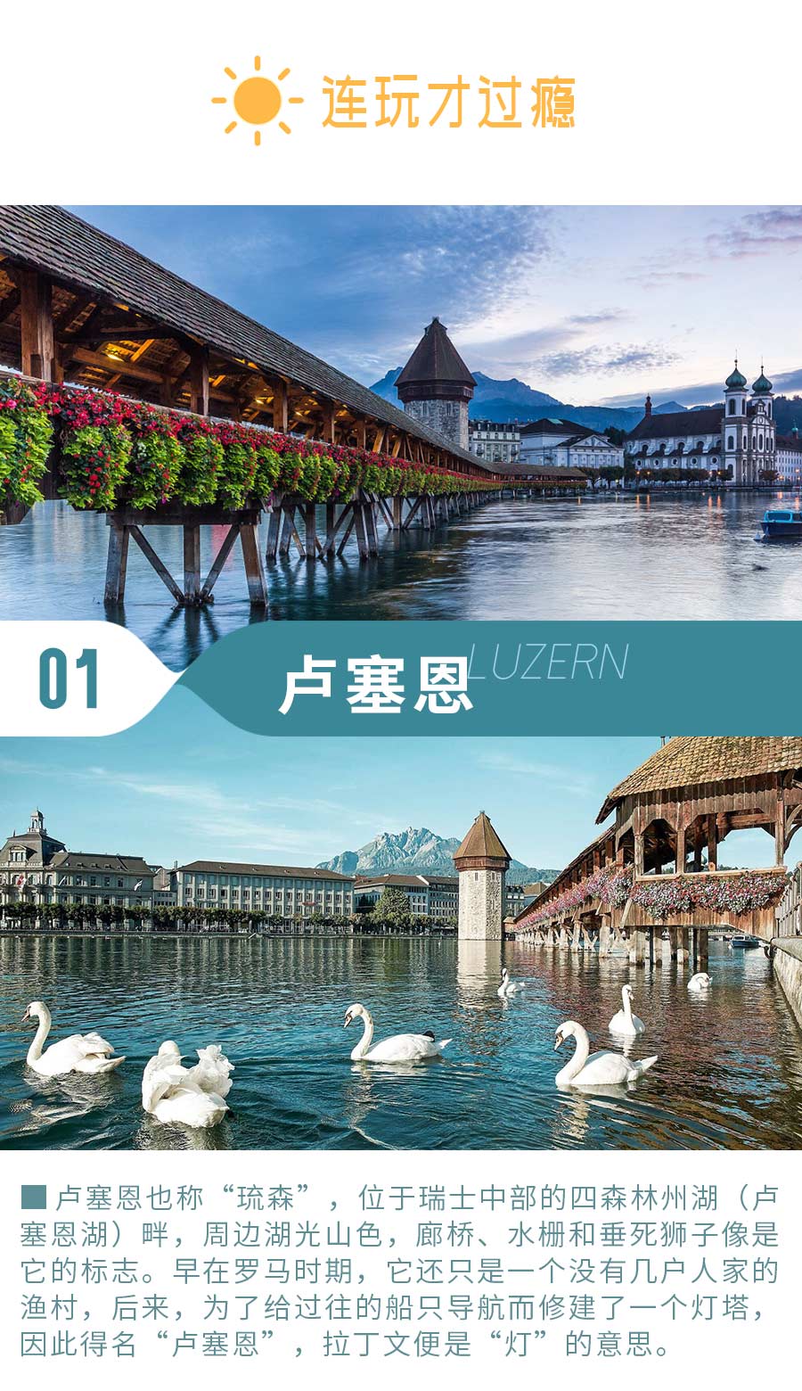 卢塞恩:一译“琉森”,位于瑞士中部的四森林州湖(卢塞恩湖)畔,小巧玲珑却历史悠久,常被称为“最瑞士的地方”,不仅具有21世纪的现代化,更具有中世纪所特有的美、和谐及生命力。周边湖光山色,映照城中美景,悠步其中,亦真亦幻。廊桥、水栅和垂死狮子像是它的标志。早在罗马时期,它还只是一个没有几户人家的渔村,后来,为了给过往的船只导航而修建了一个灯塔,因此得名“卢塞恩”,拉丁文便是“灯”的意思。