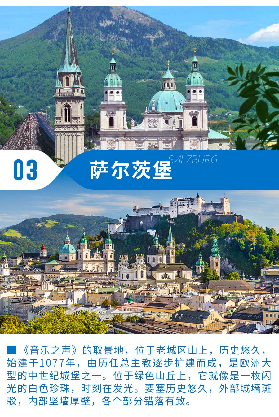 萨尔茨堡城堡:《音乐之声》的取景地,位于老城区山上,历史悠久,始建于1077年,由历任总主教逐步扩建而成,是欧洲最大的中世纪城堡之一。位于绿色山丘上,它就像是一枚闪光的白色珍珠,时刻在发光。要塞历史悠久,外部城墙斑驳,内部坚墙厚壁,各个部分错落有致。