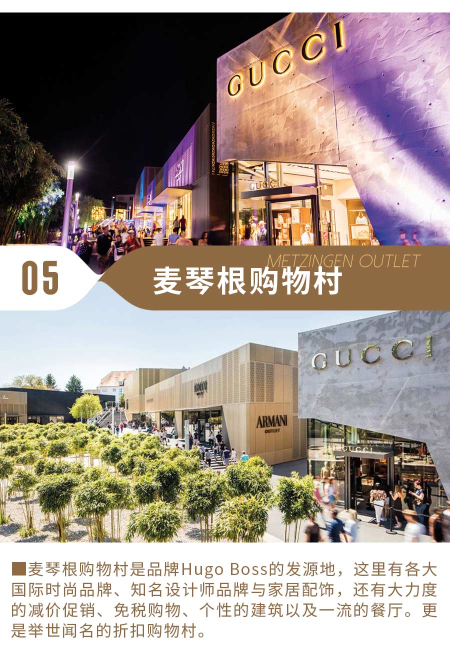 驱车前往麦琴根购物村。麦琴根购物村是品牌Hugo Boss的发源地,这里有各大国际时尚品牌、知名设计师品牌与家居配饰,还有大力度的减价促销、免税购物、个性的建筑以及一流的餐厅。更是举世闻名、独一无二的折扣购物村。