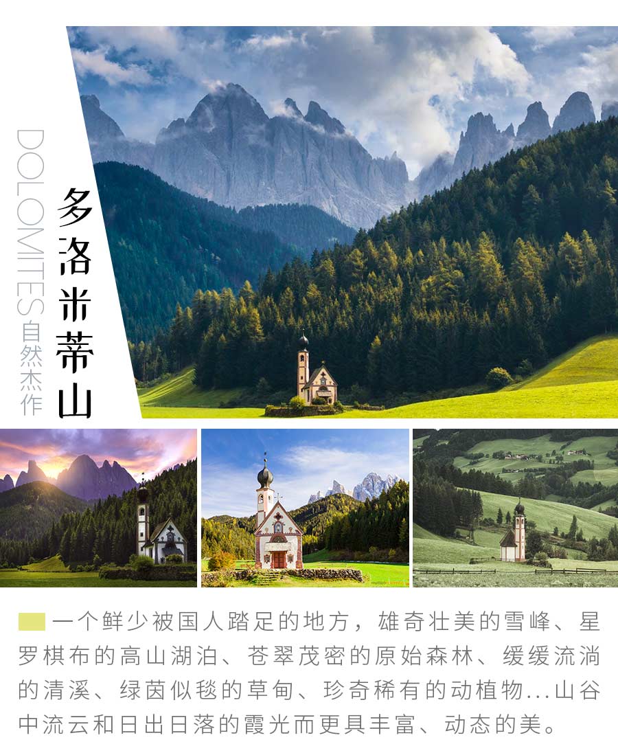 多洛米蒂:在意大利东北部与水城威尼斯之间有一片独一无二的山区:巍峨的巨型白云岩山峰直插云霄,山坡上绿草葱葱、牛羊成群的牧场连接成片,日晓日落时的阿尔卑斯之光让人流连忘返,刀切般山峰下精雕细琢的德系小镇悠然自得,这片区域有个如诗如画的名字——多洛米蒂。