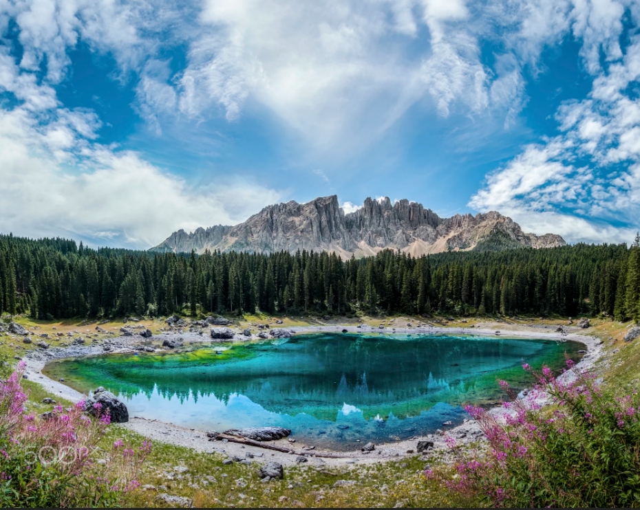 卡雷扎湖:背后是拉特马峰(Latemar),风景秀丽,犹如少女的清澈瞳孔。湖水是历年形成的冰川湖,含多种矿物质,呈现透彻的青绿色,在太阳的直射下,还会呈现出奇妙的五彩色,传说一位女神生活在翠绿的湖水之中。