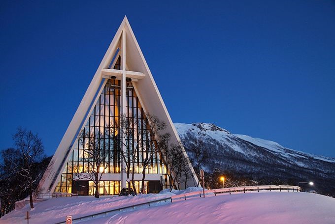※ 北极大教堂:外观呈三角形状的北极教堂。教堂运用玻璃和混凝土融合的时尚设计,与特罗姆瑟的冬季和极光巧妙结合,被当地人亲切的称为“雪之教堂”。