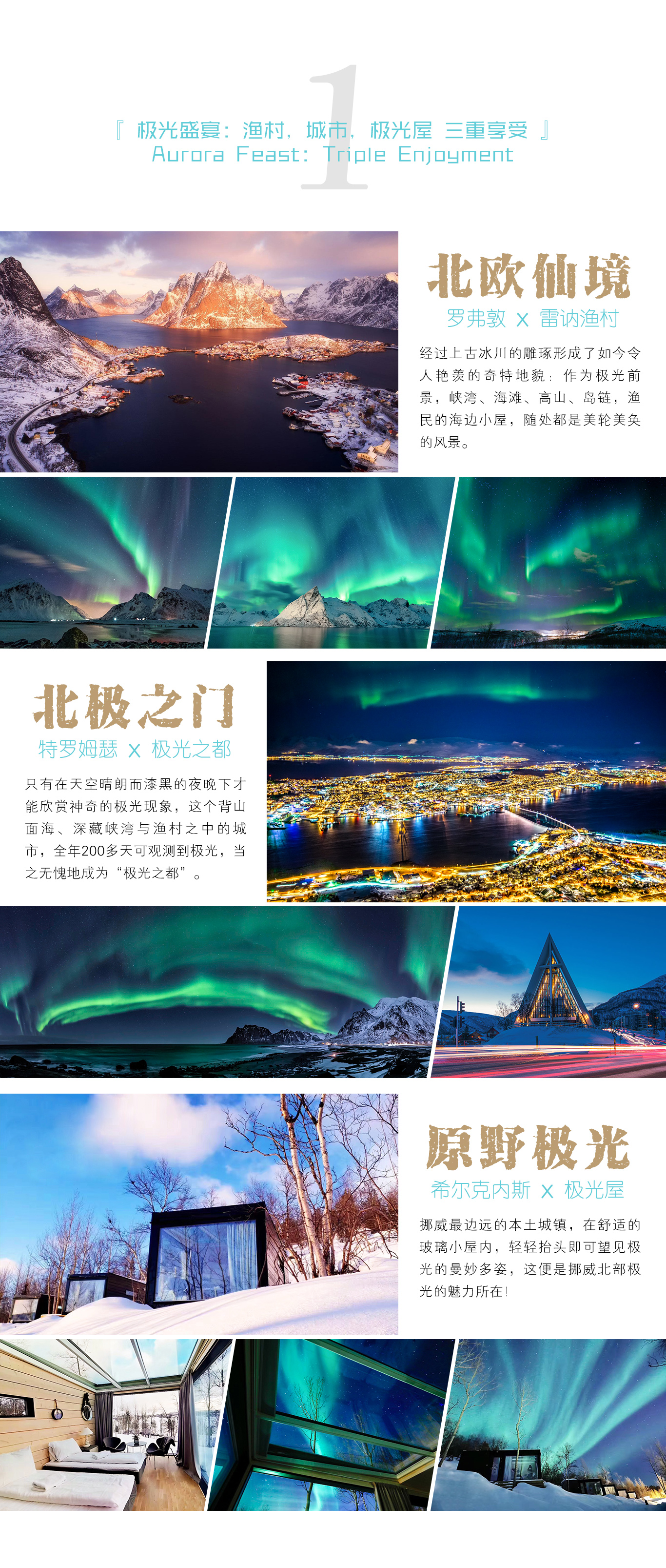 今日起,您将会进入北极圈内,后面行程的每个夜晚,您都将有机会亲密接触北极光,与它来一场美妙邂逅!