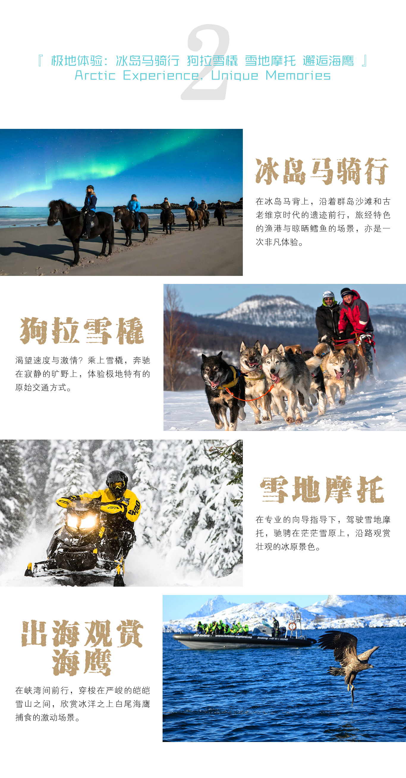 ※ 雪地摩托:在专业的向导指导下,驾驶雪地摩托,驰骋在茫茫雪原上,沿路观赏壮观的冰原景色:山脉、湖泊、森林和峡湾,给您难忘的北极雪地户外体验。