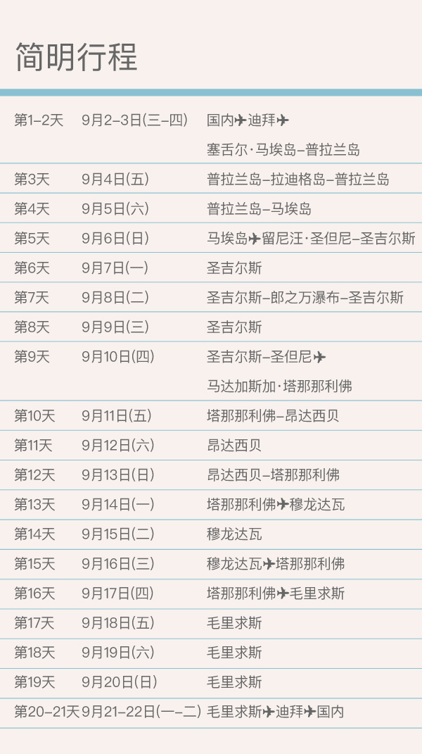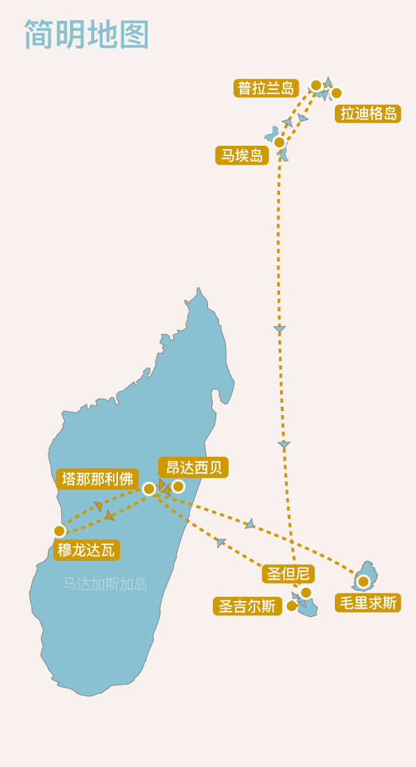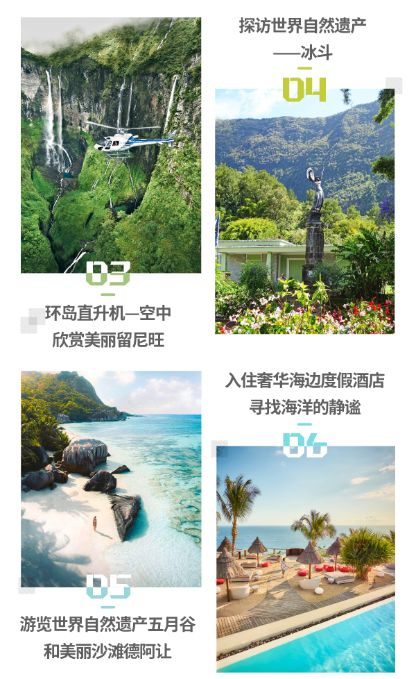 一次性饱览风格各异的香草四国:拥有神秘动物的马达加斯加、深受英国王室青睐的塞舌尔、遍布火山冰斗的留尼汪、潜水胜地毛里求斯。