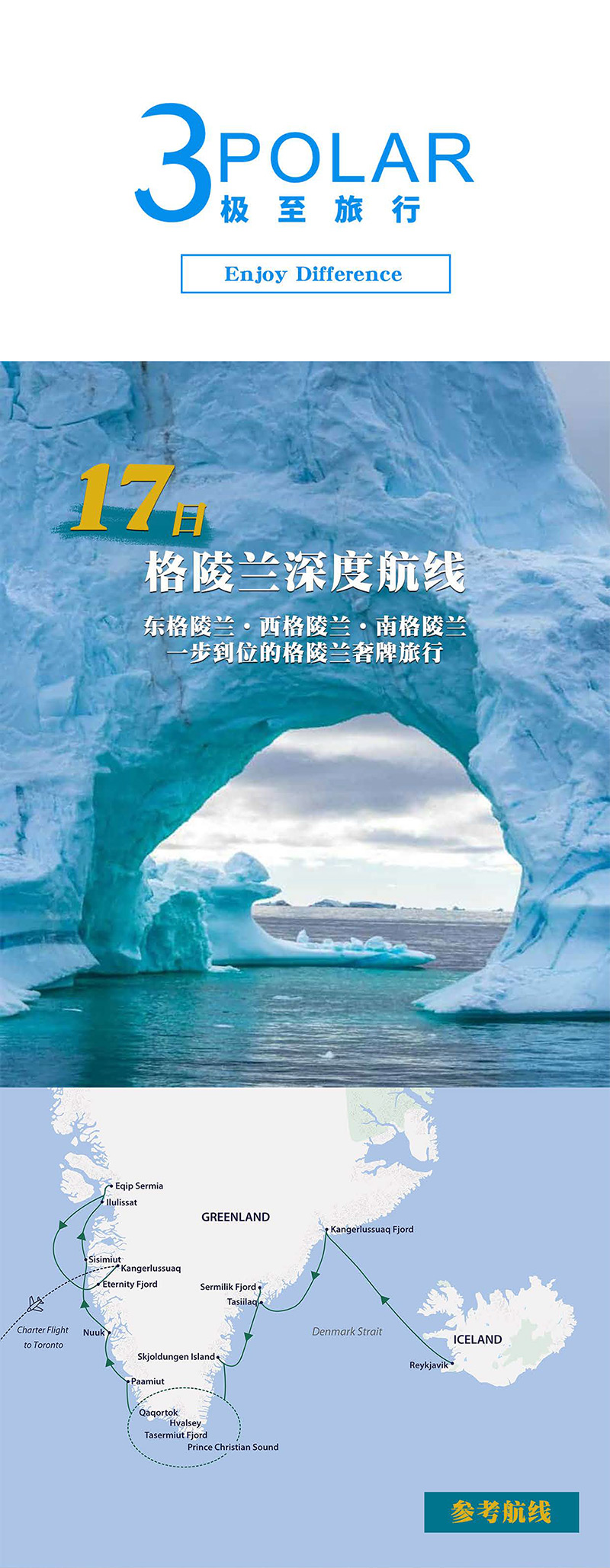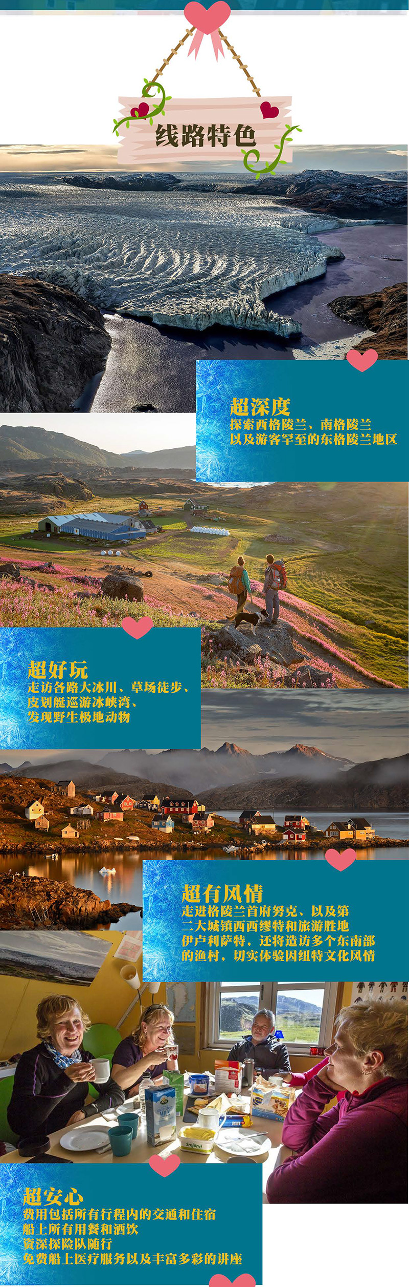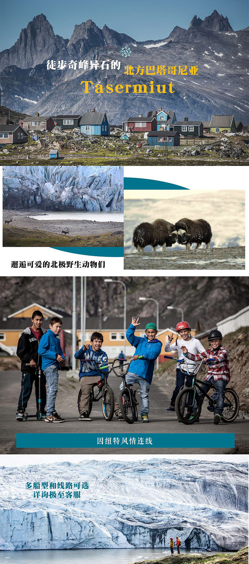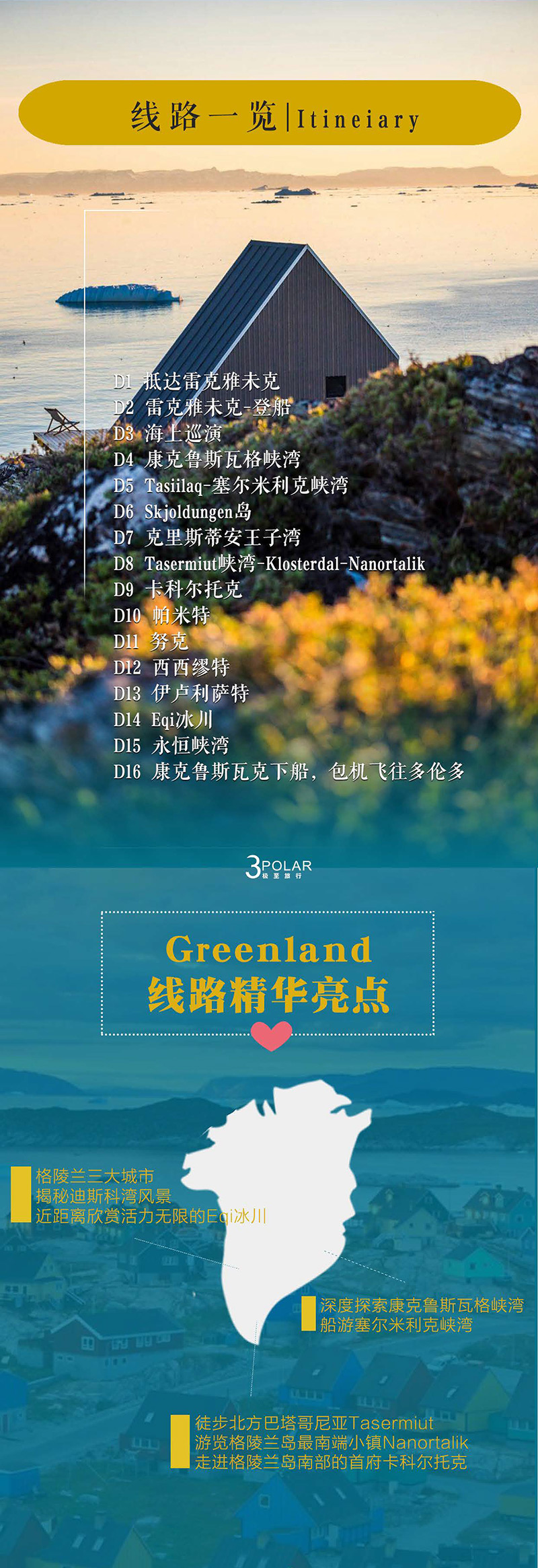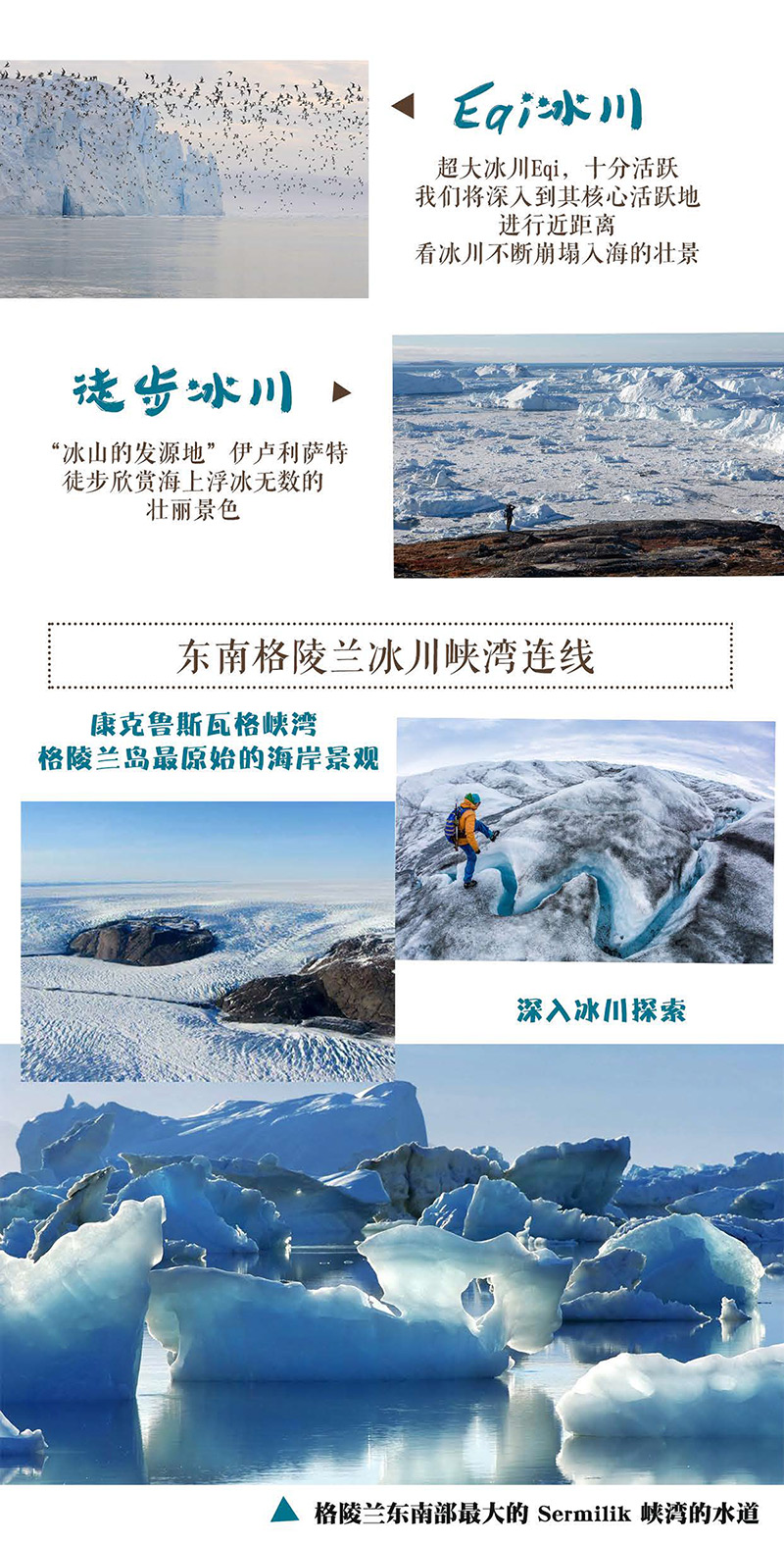 格陵兰三大城市 揭秘迪斯科湾风景 近距离欣赏活力无限的Eqi冰川;深度探索康克鲁斯瓦格峡湾 船游塞尔米利克峡湾;徒步北方巴塔哥尼亚Tasermiut 游览格陵兰岛最南端小镇Nanortalik 走进格陵兰岛南部的首府卡科尔托克