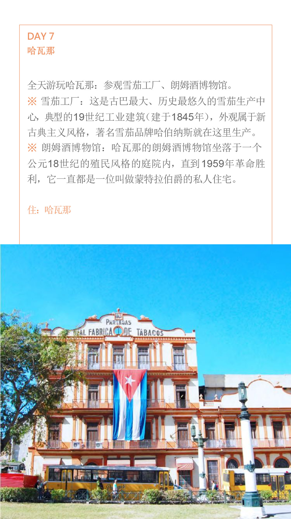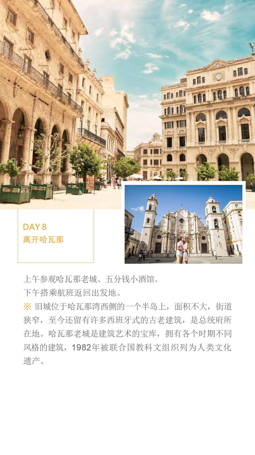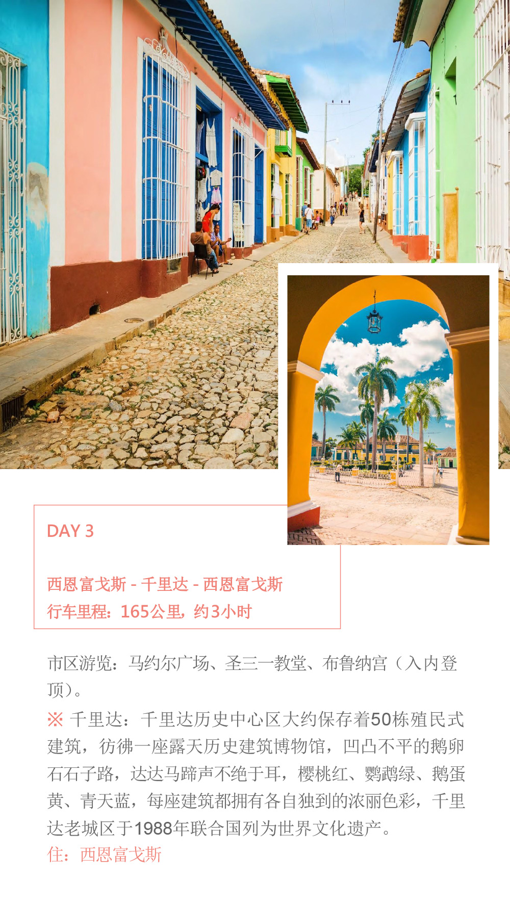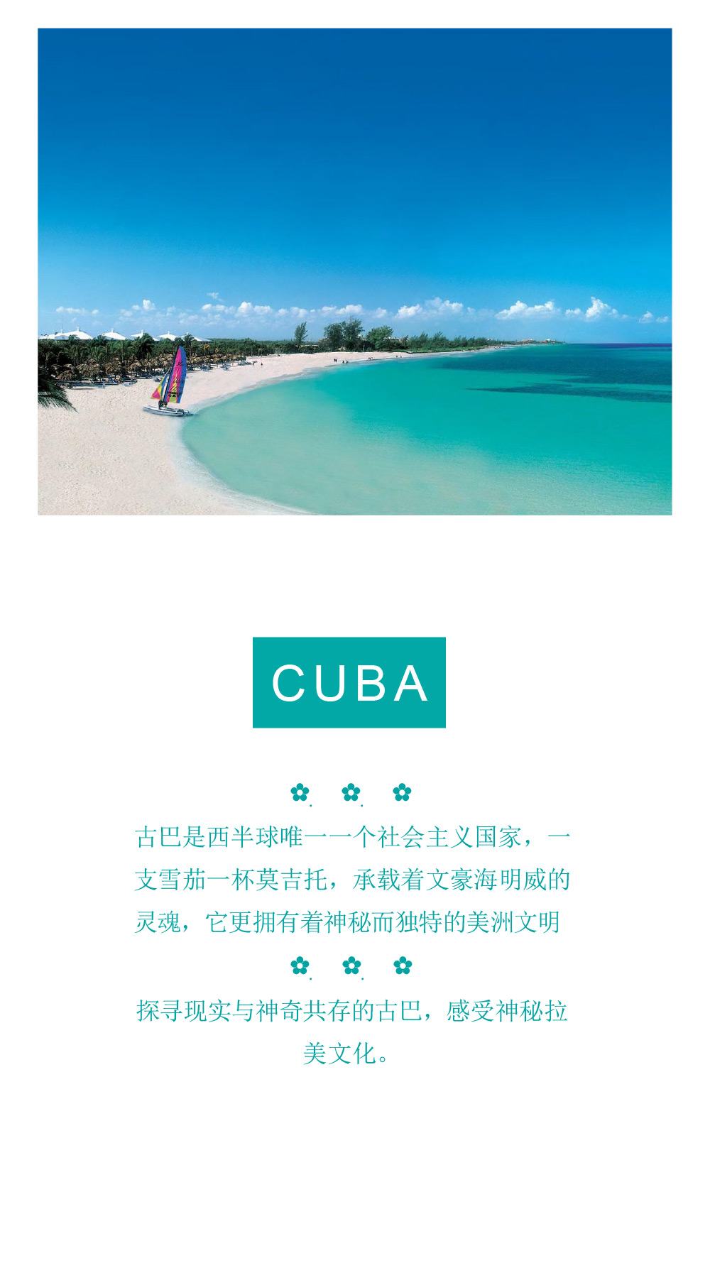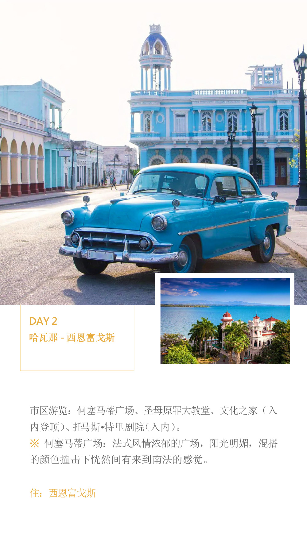 老爷车兜风 欣赏迟暮美人哈瓦那;漫游千里达 体验时光停滞的小镇;享受阳光海滩 体验地道拉美假期;