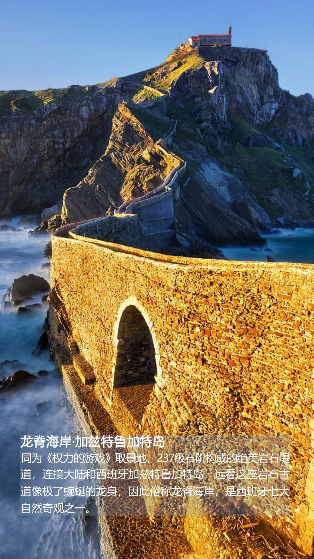 悬崖洞穴·贝纳吉;页岩群·大教堂海滩;龙脊海岸·加兹特鲁加特岛;灿烂的伊甸园·辛特拉;欧洲文化之都·吉马朗伊什;摩尔人留存的精华·格拉纳达
